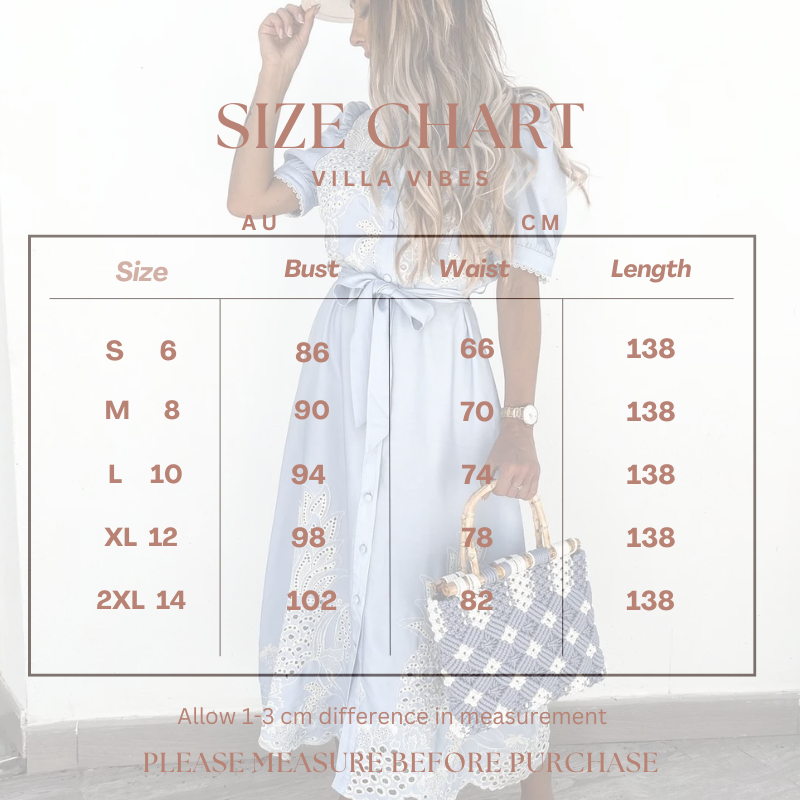 A beautifully crafted boho-style cotton blend dress, featuring delicate hollow-out white embroidery and soft puff sleeves. Designed with a flattering A-line silhouette, this ankle-length summer dress is finished with a single-breasted front and an adjustable tie-waist sash to define the shape. Effortless, breathable, and perfect for warm-weather days.