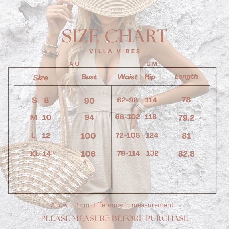Light, breezy, and oh-so-boho — your perfect playsuit for every vacation vibe! This playsuit features a deep V-neck halter front with a cross over back & bow. Chic meets comfort in this sleeveless viscose playsuit — a must-have boho look for summer escapes and weekend wanderlust.